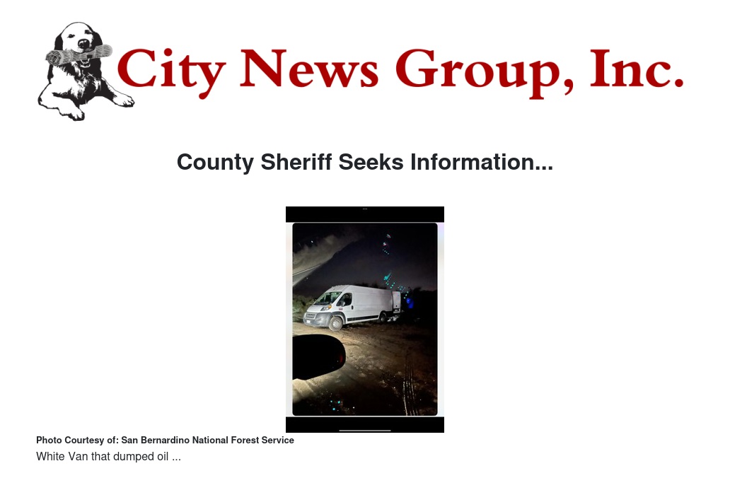 The San Bernardino National Forest and San Bernardino County Sheriff’s Department is seeking information about individuals transporting and dumping engine oil near the forest, December 2023.