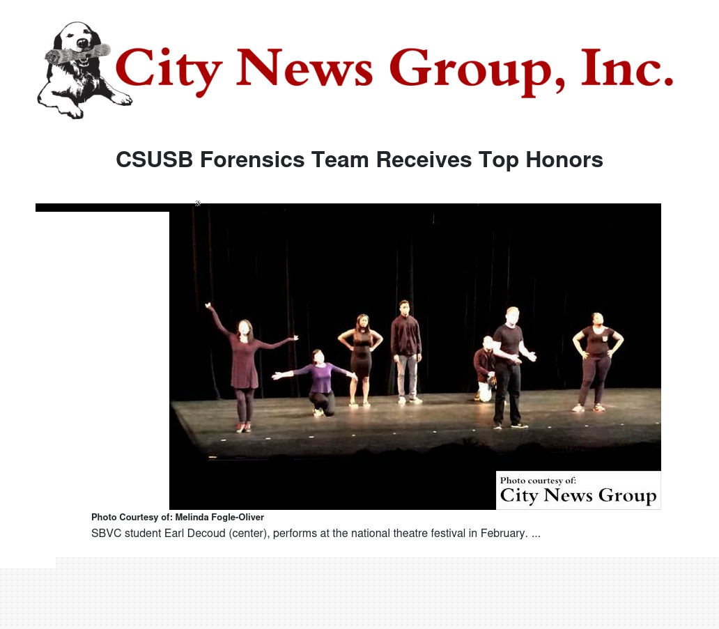 The Region VIII festival, held in Mesa, Arizona, brought together students and faculty from Southern and Central California, Arizona, Hawaii, Utah and Southern Nevada. Nine SBVC students attended, and two were cast in productions — Earl Decoud Jr. in the devised performance "Doing Nothing is Doing Something" and Elisha Bascomb in the short play "Dinner for Two."