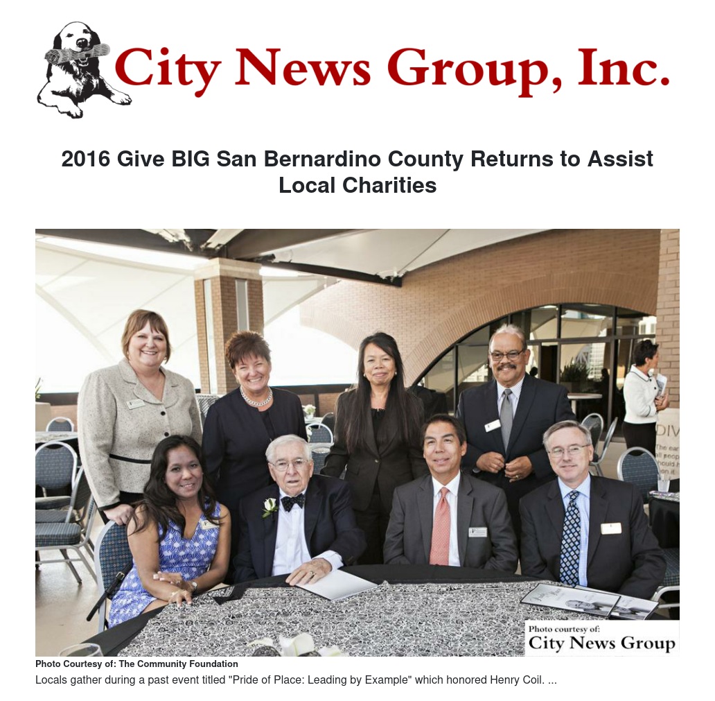 Non-profits are encouraged to sign up for the 2016 Give BIG San Bernardino County campaign, and anyone can support the 2016 Give BIG San Bernardino County by making online donations to their favorite charity. For more information and updates, please visit The Community Foundation.