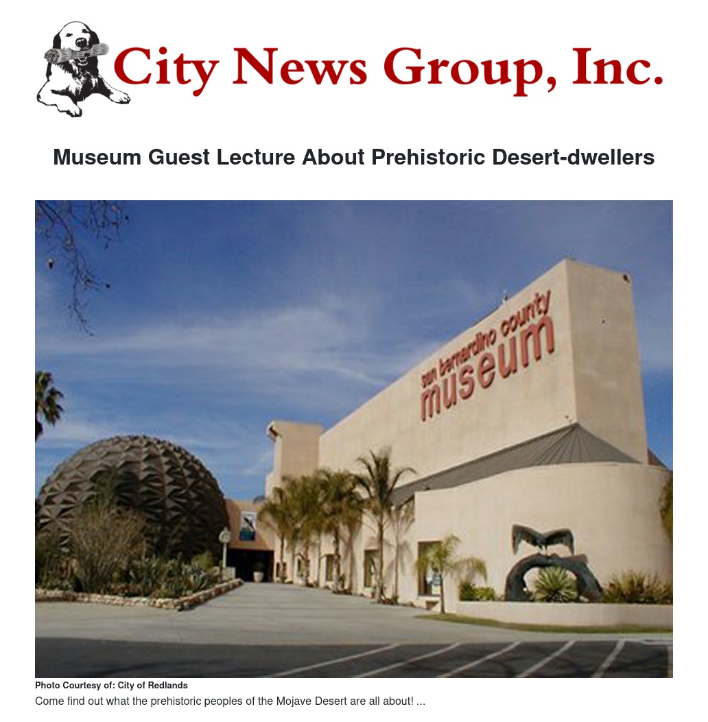 Mark Campbell will present an overview of prehistoric peoples of the Mojave Desert at a San Bernardino County Museum guest lecture on Wednesday, March 26 at 7:30 p.m. The lecture at the Redlands museum is free and open to the public.