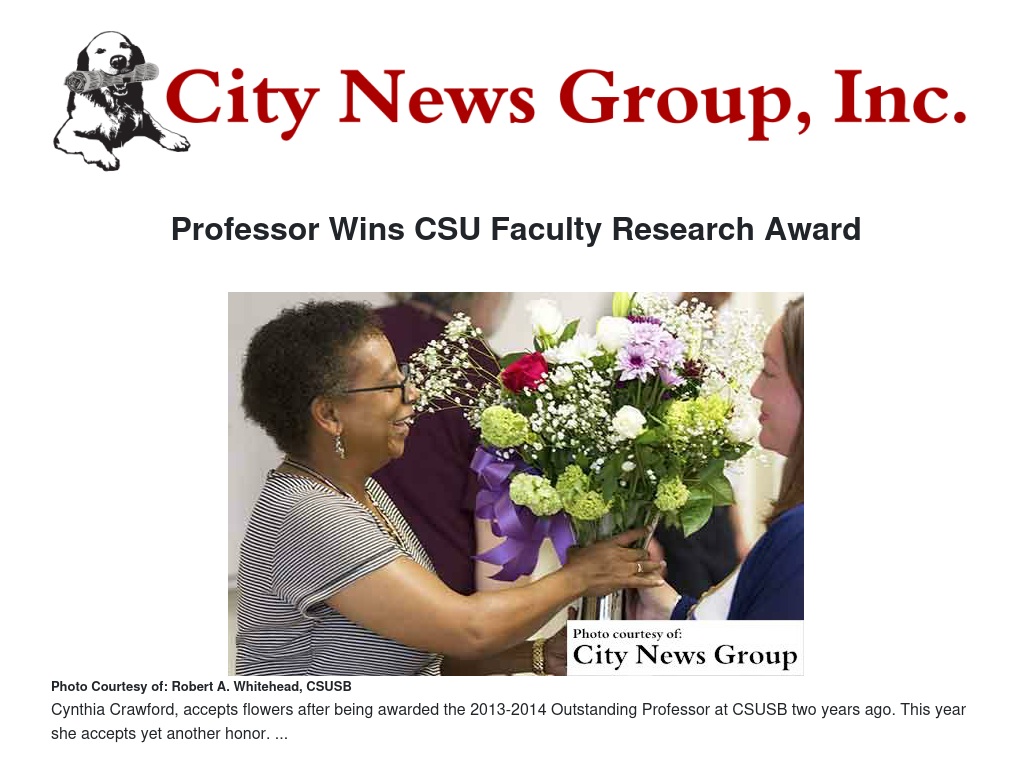 Crawford is also the recipient of the 2014 CSUSB Outstanding Professor award for her scholarship, teaching and commitment to students.