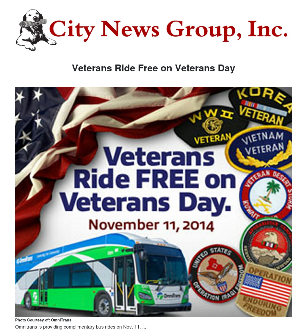 On Jan. 5, 2015, Omnitrans will introduce a new reduced fare category for veterans. “As part of our Veterans Day free ride offer, we hope to build awareness for the new fare and encourage veterans to get a retired military ID, if they don’t have one already,” said Omnitrans spokesperson Wendy Williams.