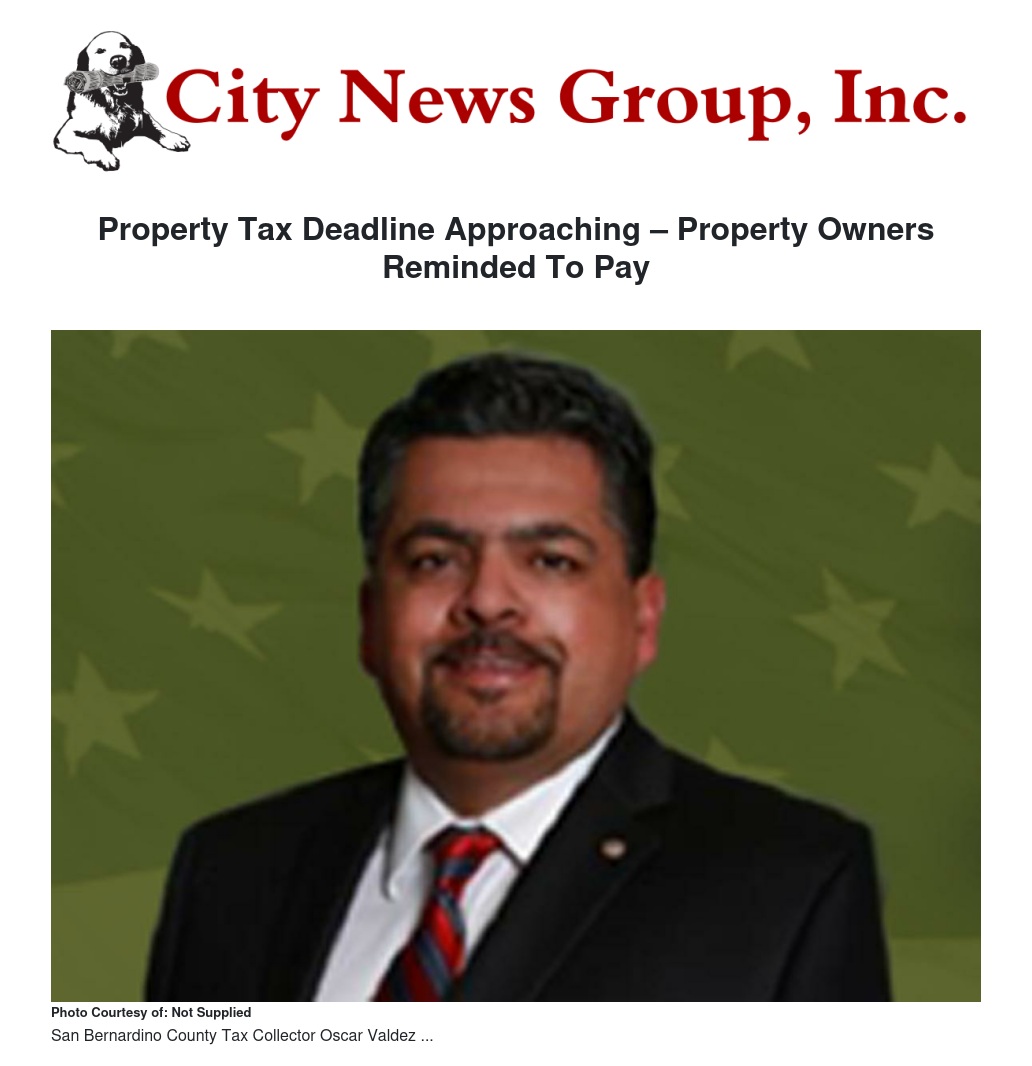 San Bernardino, CA — San Bernardino County Tax Collector Oscar Valdez is encouraging property owners to pay the first installment of their property taxes by Monday, December 11, to avoid a 10% penalty. The Tax Collector’s Office offers many convenient ways to pay, including online, by phone, by mail, and in person.
