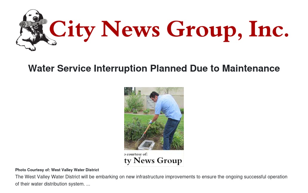 In order to help customers prepare for the planned outage, WVWD has mailed letters to customers impacted by this project and will also place a door hanger at the property 48-hours in advance. A few things that customers can do in advance to help minimize the impacts of the outage include: Fill up the bath tub or five gallon buckets so toilets can be refilled for flushing and fill clean pitchers with water and place in the refrigerator for drinking.