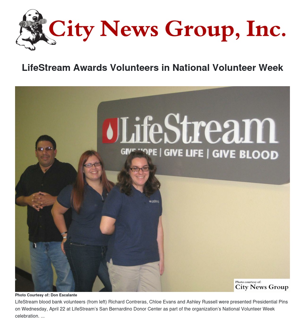 LifeStream blood bank volunteers received Presidential pins for service during 2014 and the Shining Star as “Rookies of the Year” on April 22 at LifeStream’s San Bernardino Donor Center, and April 23 at the Ontario Donor Center.