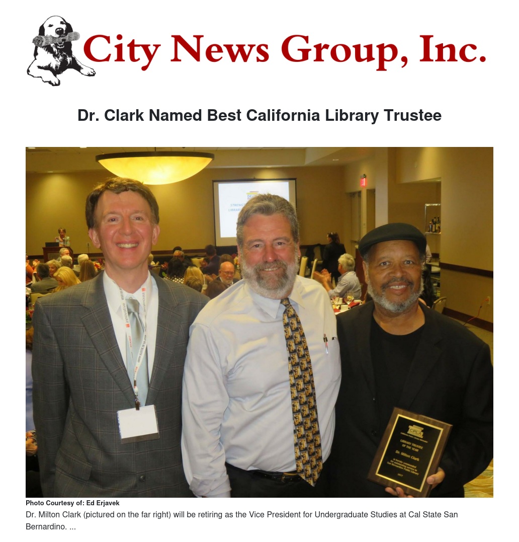 “Dr. Clark is most deserving of this honor since I doubt there’s a Library Board President in the country who has done as much in advocating for their library system in the last decade,“ said Erjavek, who nominated him for the award. “His leadership and passion for library service in San Bernardino have been instrumental in helping to preserve library service in this community. I tell people he is the finest Library Board President in America. He was the right man to lead the Library Board of Trustees during this last challenging decade in San Bernardino.”