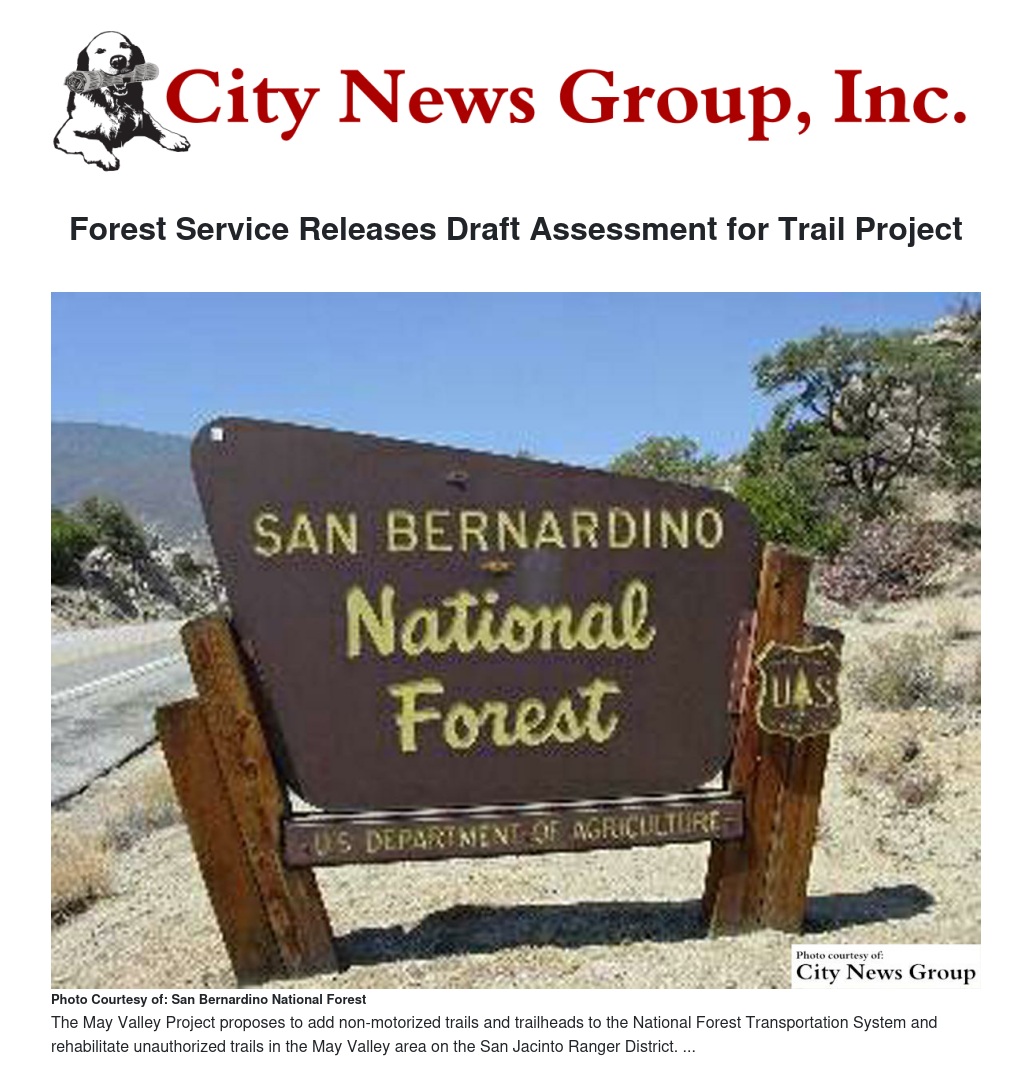 SAN BERNARDINO >> The San Bernardino National Forest has completed a Draft Environmental Assessment (Draft EA) for the May Valley Non-Motorized Trail Project.