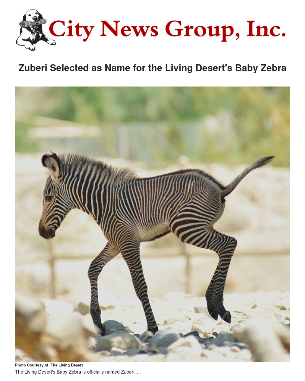 The Living Desert is excited to announce the official name of the baby Grevy Zebra born at the zoo at the end of May. After weeks of voting by visitors, the name Zuberi (pronounced Zoo-BERRY) received the most votes.