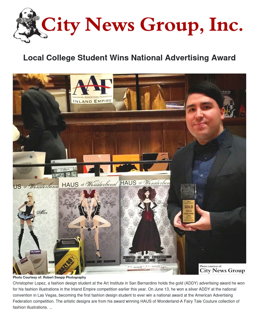 His creation, HAUS of Wonderland—A Faily Tale Couture, earned the award for excellence in the Illustration Campaign category. To advance to the national level, Lopez needed to win at two levels of competition. He first won a gold ADDY in local Inland Empire competition, then a silver award at the district level earlier this year.
