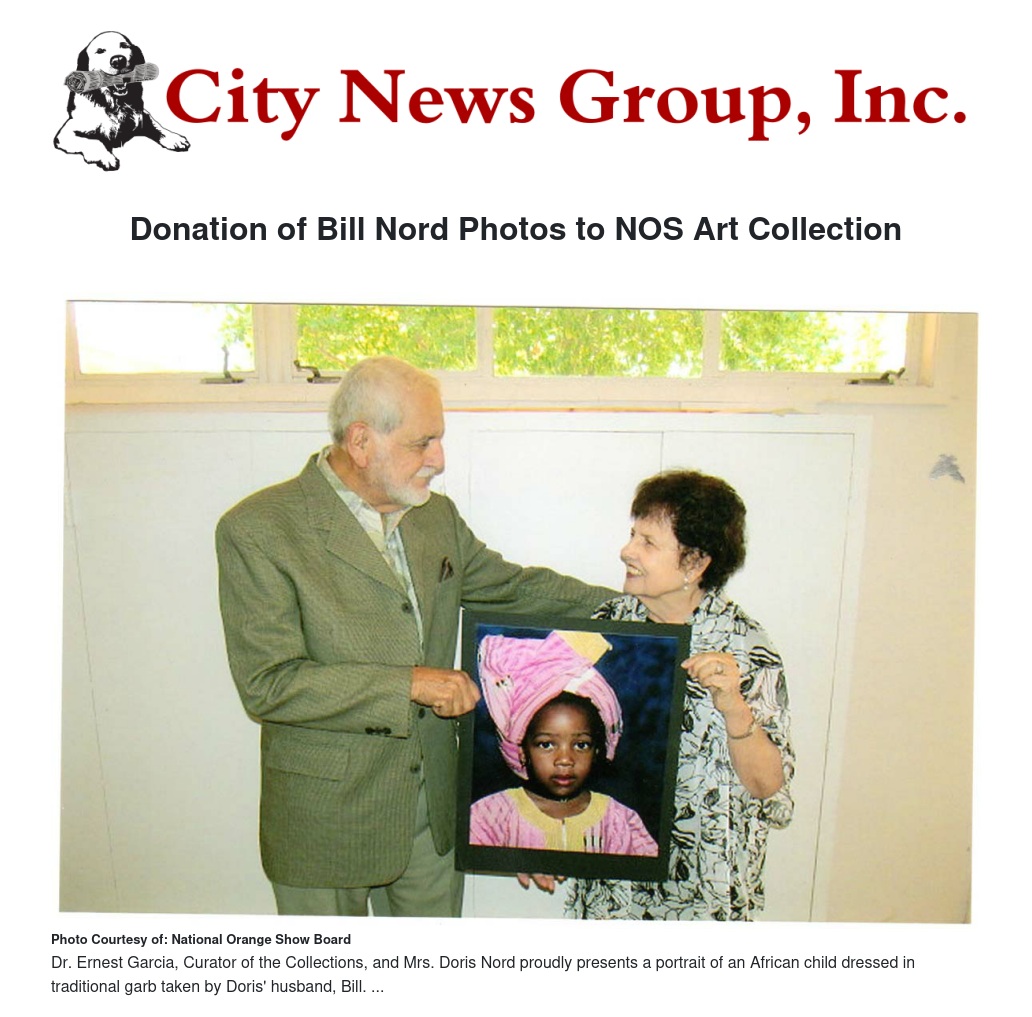 “Dear Mrs. Nord, The Board of Directors of the National Orange Show wishes to express its gratitude for the donation of 25 portraits of Africans taken by Bill Nord in domestic and international sites. The collection will join the Orange Show art as the second permanent collection to be displayed periodically at our gallery."
