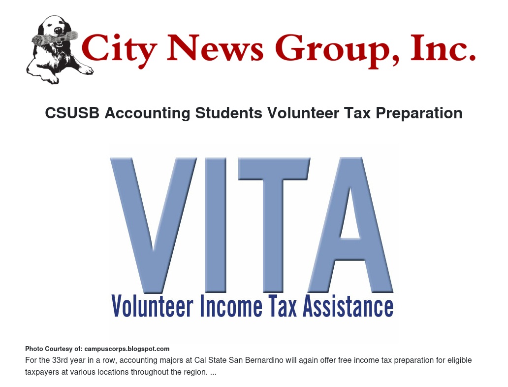 CSUSB accounting students will be available to prepare tax returns at the Cal State San Bernardino campus and at five other San Bernardino County locations for low-income and elderly taxpayers who have a maximum income of $60,000. The service is sponsored by the Internal Revenue Service and California’s Franchise Tax Board.