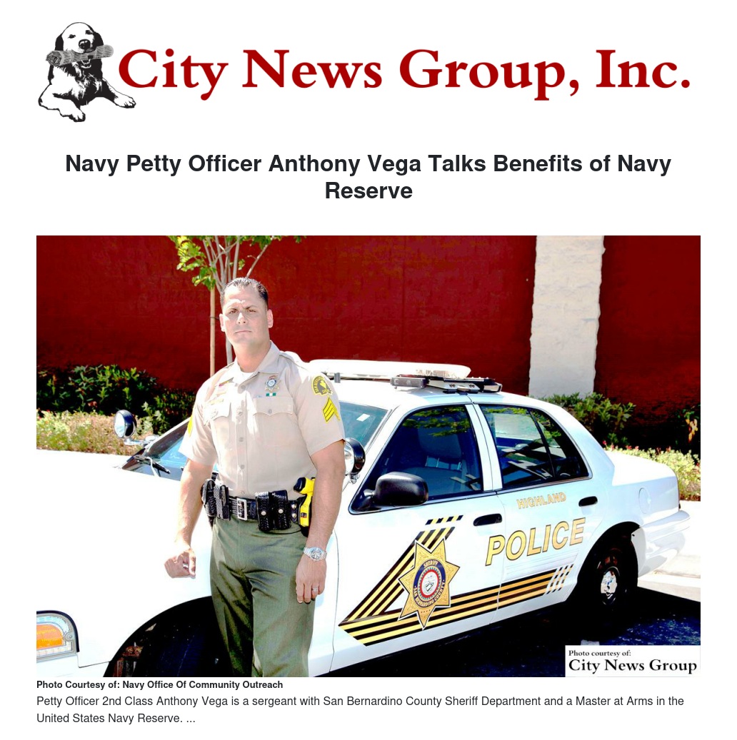 In addition to being a sergeant with San Bernardino County Sheriff Department, Petty Officer 2nd Class Anthony Vega has committed to serving the nation as a Master at Arms in the United States Navy Reserve assigned to Navy Operational Support Center, Moreno Valley.