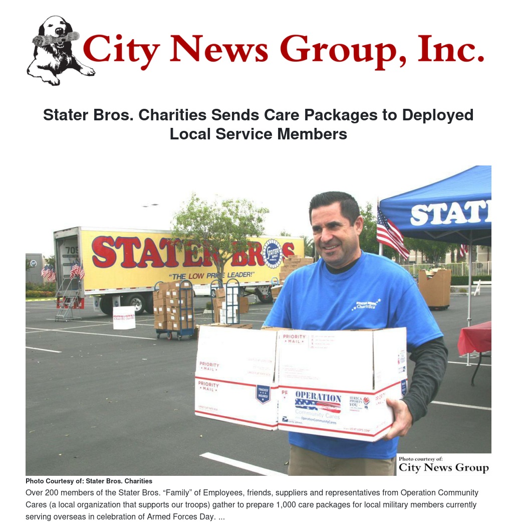 “We at OCC are so excited to have worked with Stater Bros Charities to continue the mission to boost morale for our men and women overseas," said Ryan Orr, Vice President of Operation Community Cares. "The feedback we continue to get has been overwhelming as to how much a care package can do. To think some simple items sent with love, can lift spirits and make them smile. We are told it saves lives. God Bless Stater Bros. and all they do for our community."
