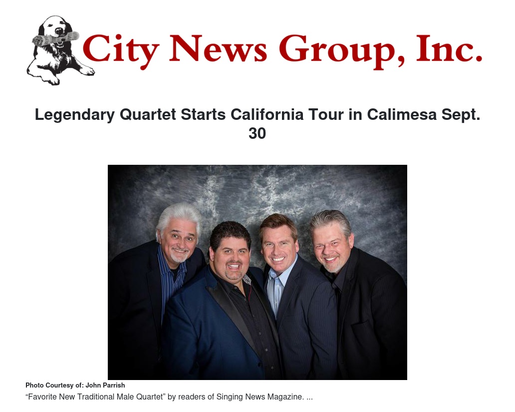 The Freedom Quartet, a Tennesee-based concert and recording group with deep southern-gospel musical roots, is kicking off its nine-city California tour next month with an appearance in Calimesa. The Sept. 30 concert will be at 7:30 p.m. in the Calimesa Seventh-day Adventist Church, 391 Myrtlewood Dr., Calimesa, announces Calimesa Community Concert Series coordinator Dr. Bob Soderblom.
