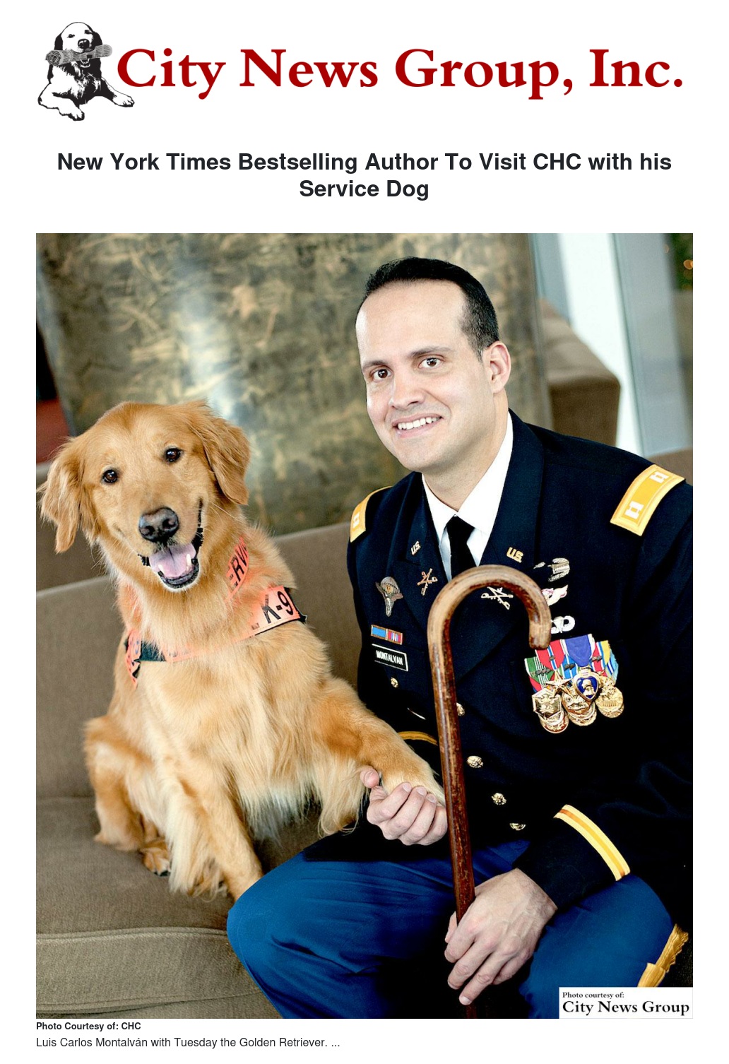 New York Times bestselling author Luis Carlos Montalván and his service dog, Tuesday, will visit Crafton Hills College on Wednesday, April 1, from 5-7 p.m. in the Performing Arts Center, for an author talk and book signing.