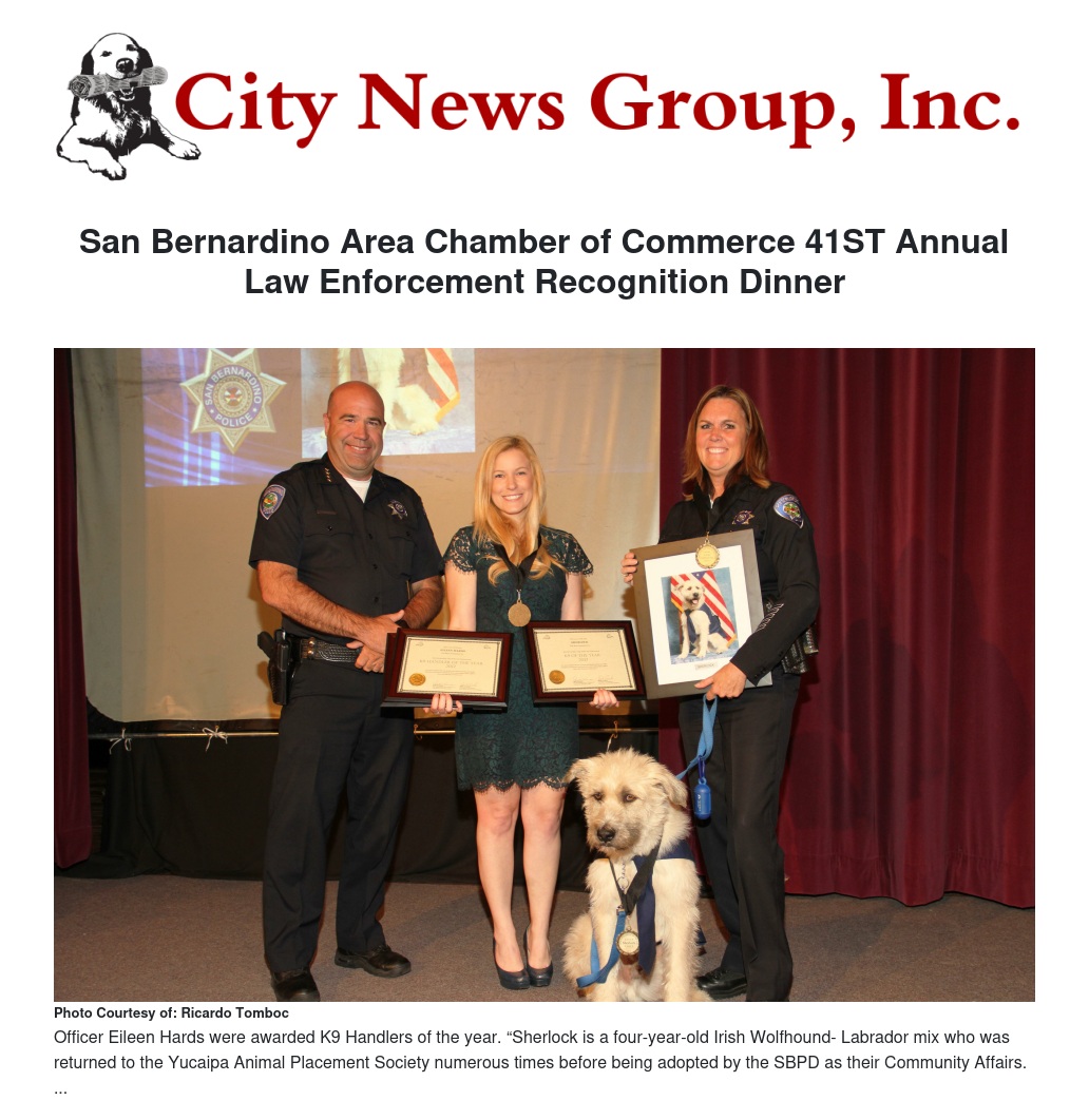 Officer Eileen Hards were awarded K9 Handlers of the year. “Sherlock is a four-year-old Irish Wolfhound- Labrador mix who was returned to the Yucaipa Animal Placement Society numerous times before being adopted by the SBPD as their Community Affairs. Sherlock brought peace and calm to the children after the horrific Northpark Elementary School shooting and participates in many community and school programs such as Tip-a-Cop and Special Olympics torch run. Sherlock spends night and weekends with Handler Lt. Vicki Cervantes and days with Community Engagement Officer Eileen Hards.”