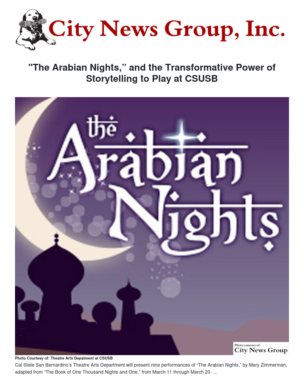 SAN BERNARDINO >> In winter 2016, Cal State San Bernardino’s theatre arts department will present “The Arabian Nights,” by Mary Zimmerman, adapted from “The Book of One Thousand Nights and One.”