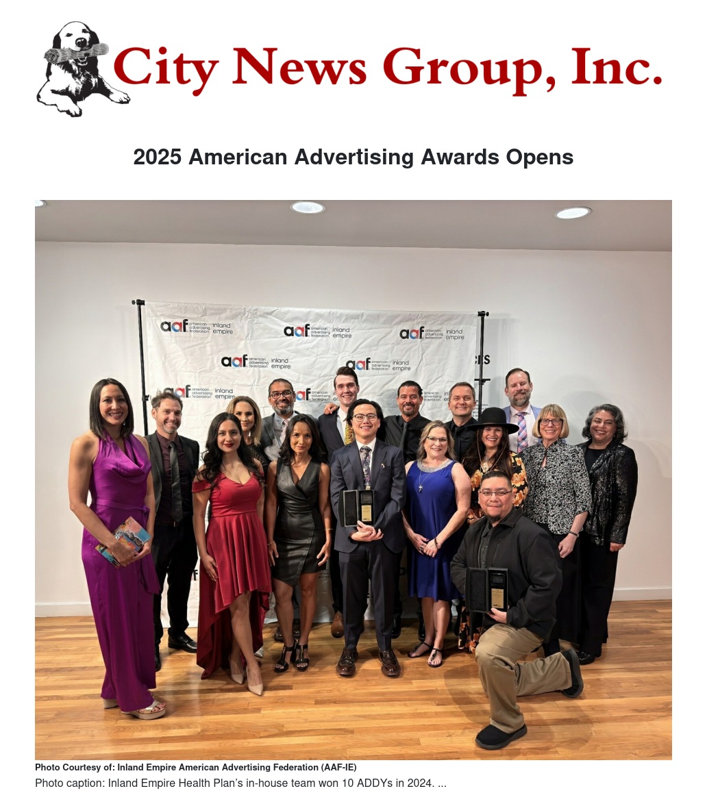Mark Landon, Awards Chair of the Inland Empire American Advertising Federation (AAF-IE), announced the 2025 competition is now open for entries. “This prestigious competition recognizes and celebrates the best work from advertising professionals and students in the Inland Empire region,” says Landon.