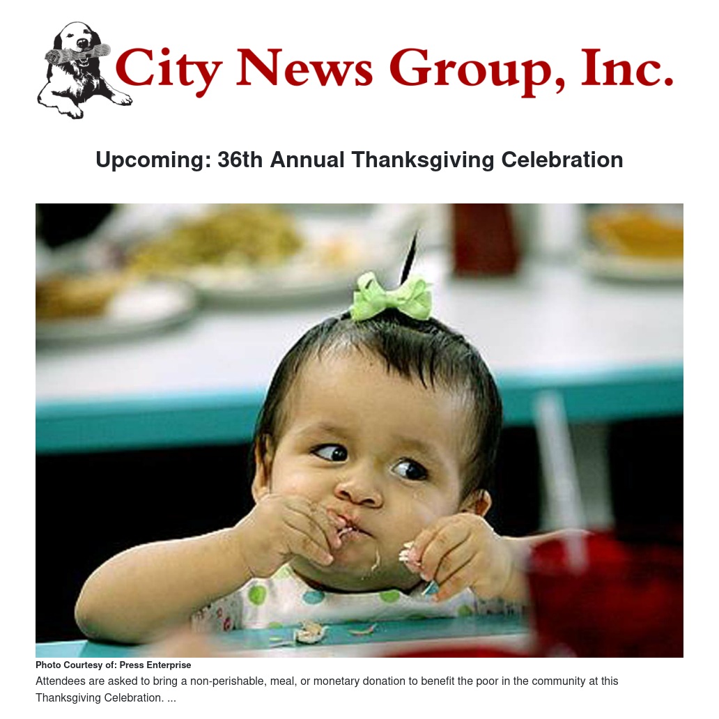 The 36th annual San Bernardino Clergy Association (SBCA) Community Thanksgiving Celebration is scheduled for Tuesday, Nov. 25, at 7 p.m. This year's celebration will be held at First Presbyterian Church of San Bernardino located at 1900 North D Street and is hosted by Rev. Sandy Tice.