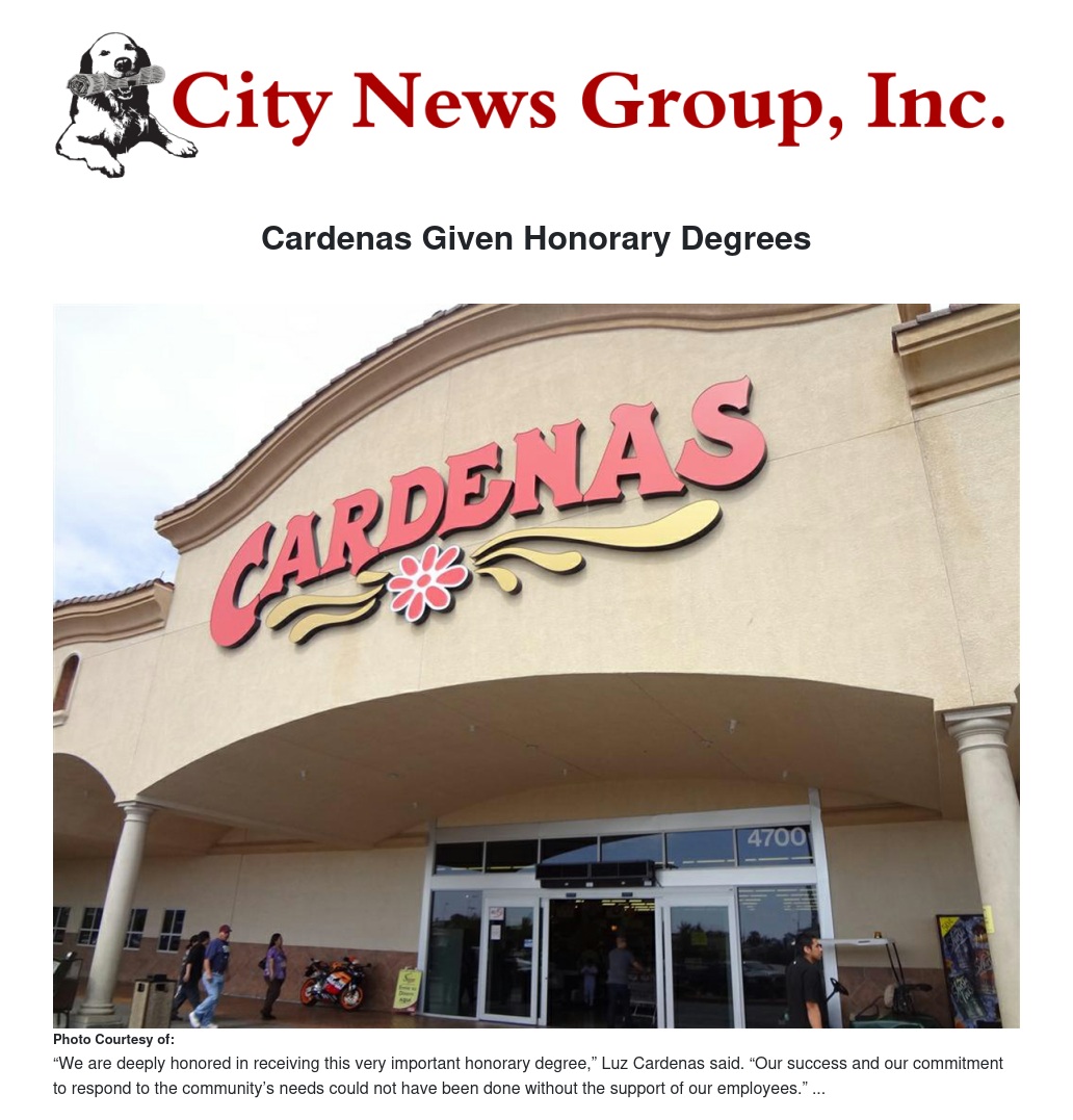 The family established the Cardenas Markets Scholarship Foundation Inc., which has served as one of the Inland Empire’s leading philanthropic organizations, supporting programs at Cal State San Bernardino as well as the University of California, Riverside, Cal Poly Pomona, the University of La Verne, Mt. San Antonio College, Chaffey College, College of the Desert and Imperial Valley College.