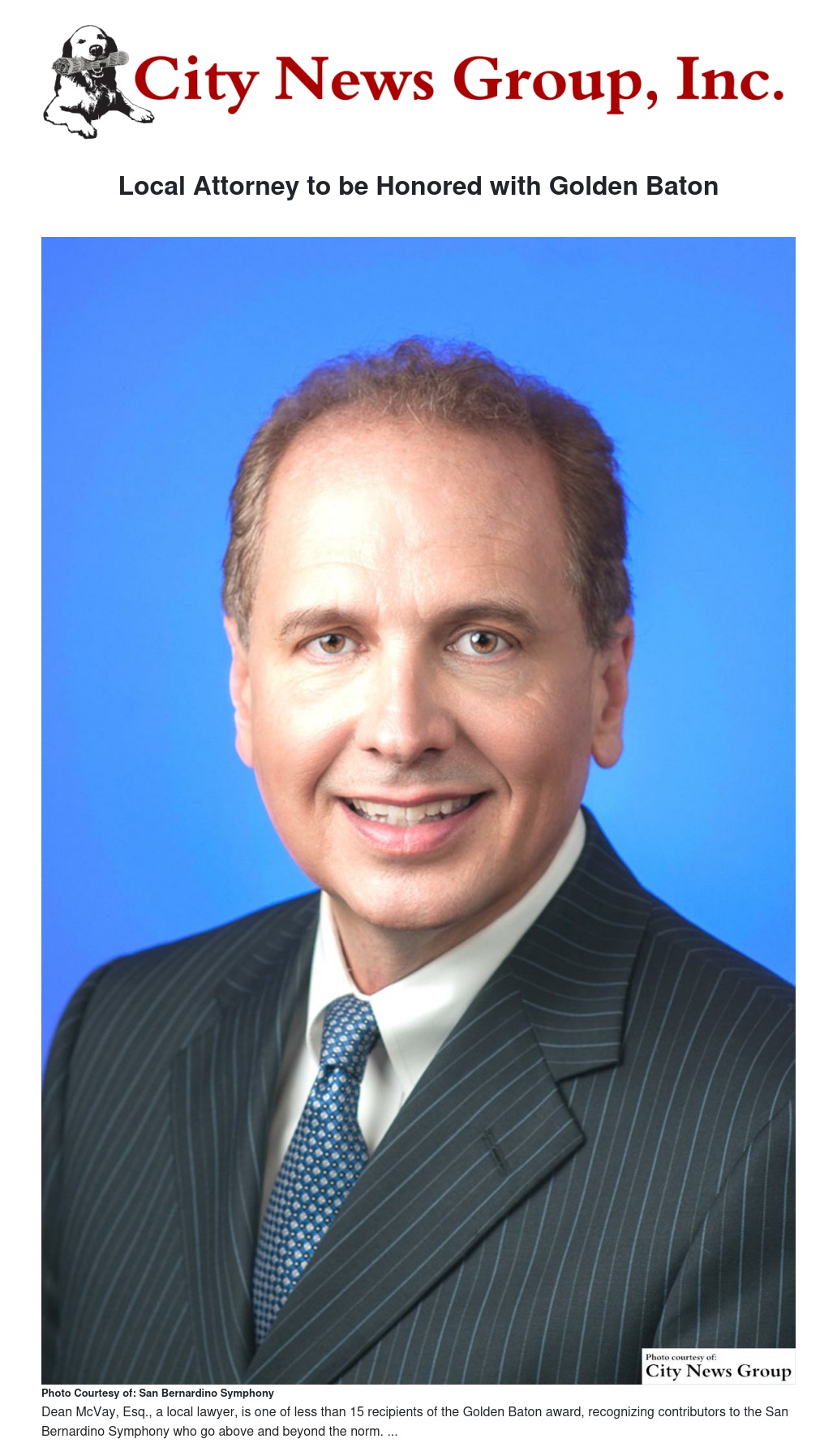Dean McVay, Esq., has been named by the San Bernardino Symphony Guild as the most recent recipient of the Golden Baton Award.
