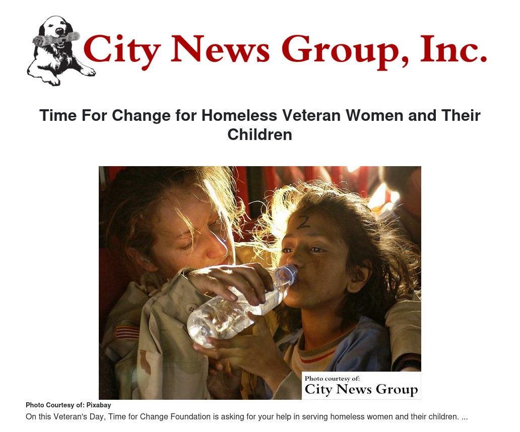 The fastest growing segment of the homeless population is female veterans, often with children in tow. Homeless women including female veterans, are overwhelmingly victims of abuse, domestic violence, suffer PTSD, and are often the sole supporters of their children. On this Veteran's Day, Time for Change Foundation is asking for your help in serving homeless women and their children.