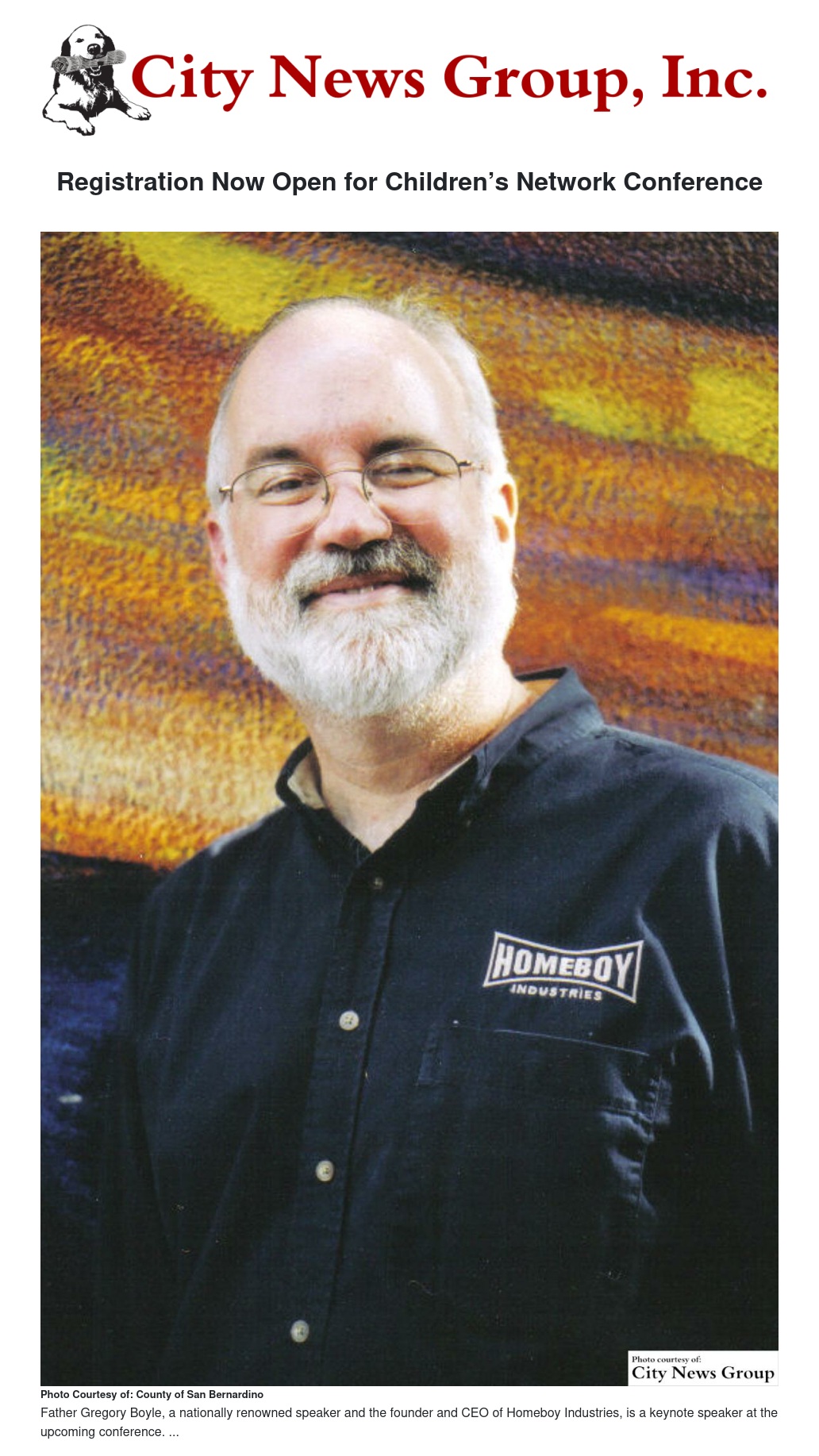 A Jesuit priest who founded the world’s largest gang intervention, rehabilitation and re-entry program will share his message of hope at the upcoming Children’s Network Conference. Father Gregory Boyle will be the keynote speaker on the first day of the Sept. 23-24 conference at the Ontario Convention Center. Now in its 29th year, the event is one of the Inland Empire’s premier training events for professionals in the fields of social work, mental health, juvenile justice, child development, child welfare, medicine and nursing.