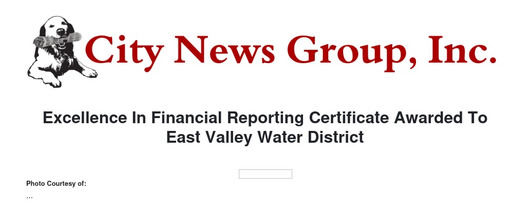 Excellence In Financial Reporting Certificate Awarded To East Valley Water District