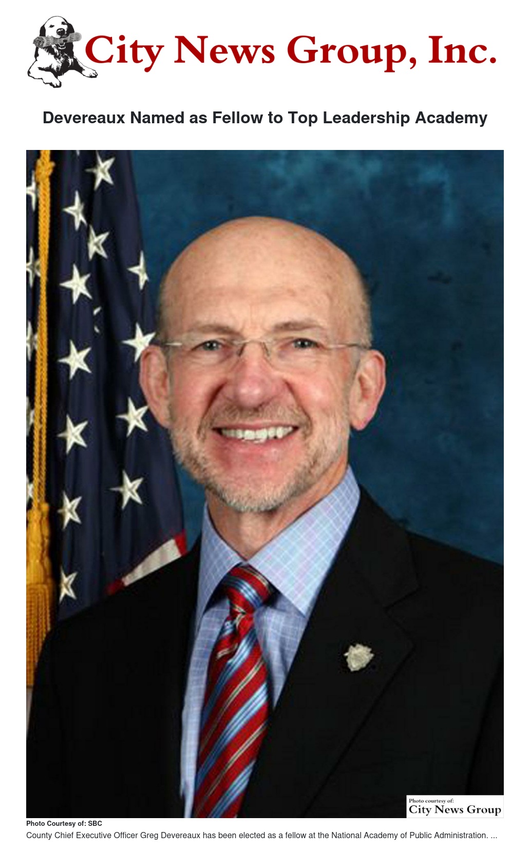County Chief Executive Officer Greg Devereaux has been elected as a fellow at the National Academy of Public Administration, where he will join a long list of national dignitaries including former Secretary of State Colin Powell, former Attorney General Dick Thornburg, former Cabinet Secretary Donna Shalala, and former Sen. Richard Lugar.