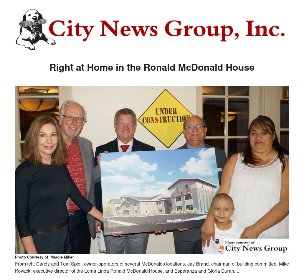 Tom and Candy Spiel, among other contributors, were instrumental in the construction of the first Ronald McDonald House in Loma Linda and are looking to help with the current expansion effort. It was this type of need that attracted the Spiels in the first place.