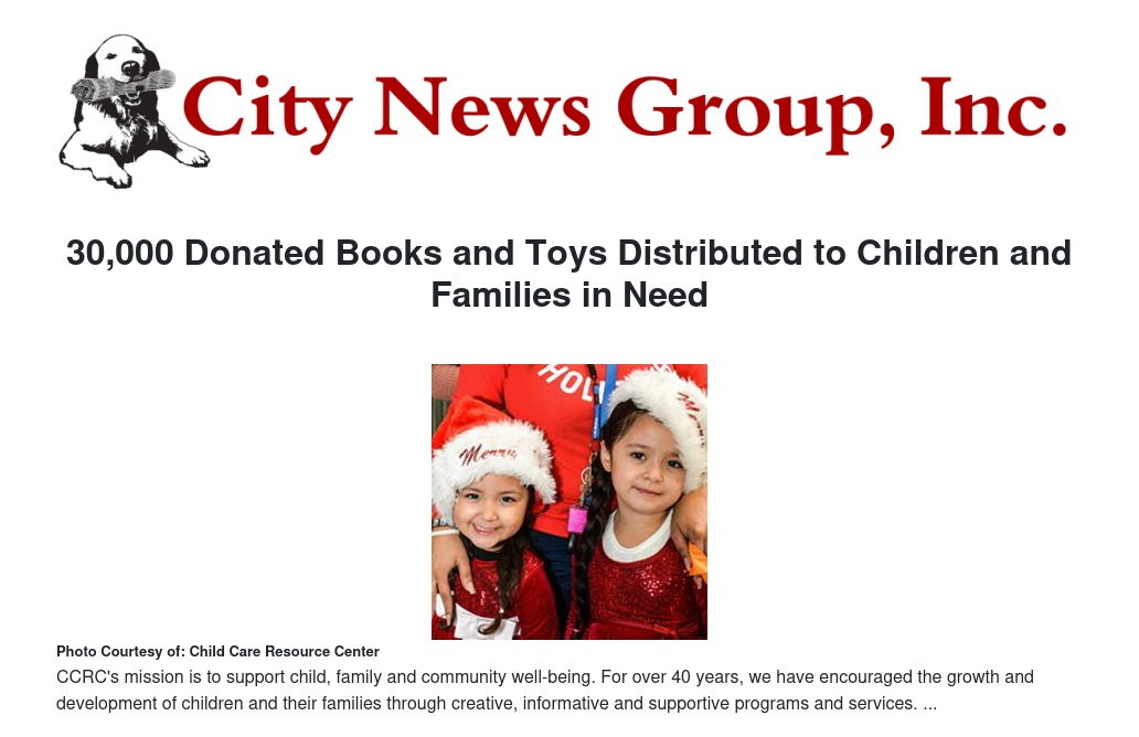 San Bernardino, CA -- Child Care Resource Center (CCRC) wrapped and distributed 30,000 age appropriate books and gifts to children served by the agency in its many programs. Currently, there are over 330,000 children living below poverty in CCRC’s service area. Each year we engage the community to make the holidays a little brighter for thousands of local children.