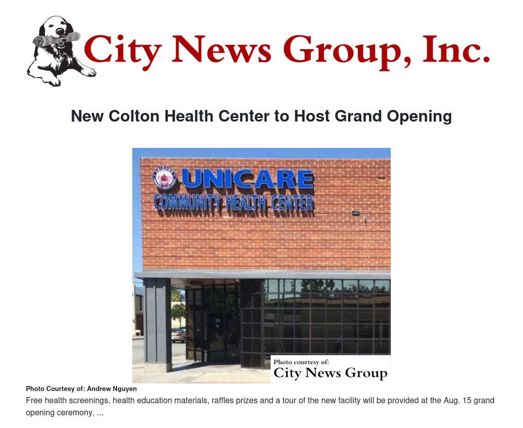 COLTON>> Unicare Community Health Center (UCHC) will host a grand opening and ribbon cutting ceremony of the new health center in the City of Colton, located at 308 N. La Cadena Drive, CA 92324.