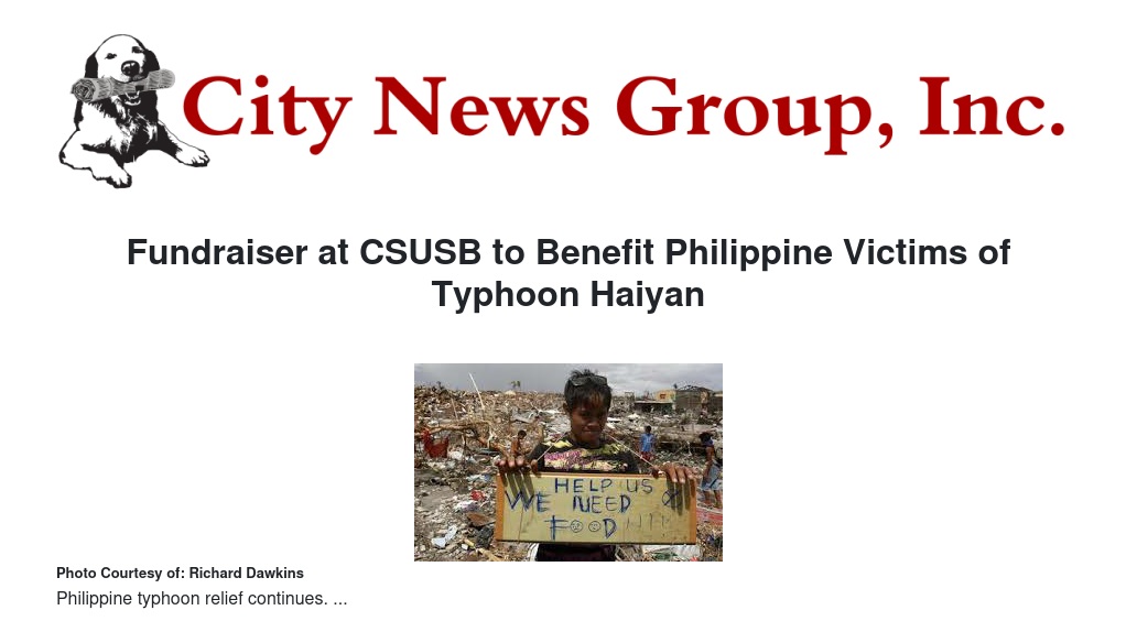 For those who cannot attend “A Fundraiser for the Philippine Typhoon Haiyan Victims,” but still want to contribute, donations may be sent to: Lubos PAS0, c/o Professor Kathleen Nadeau, Department of Anthropology, California State University, San Bernardino, 5500 University Parkway, San Bernardino, CA 92407. Checks should be made out to Lubos PASO.