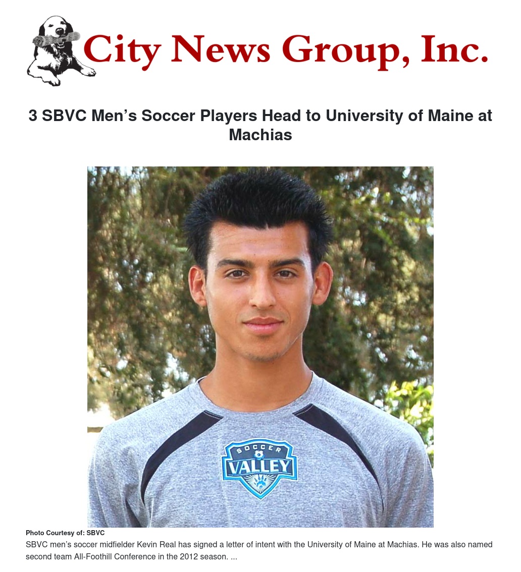 San Bernardino Valley College (SBVC) Men’s Soccer midfielder Kevin Real (Riverside La Sierra), defender Marco Arias (Riverside La Sierra), and forward Alfredo Palacios (Norco H.S.) have signed letters of intent with the University of Maine at Machias.