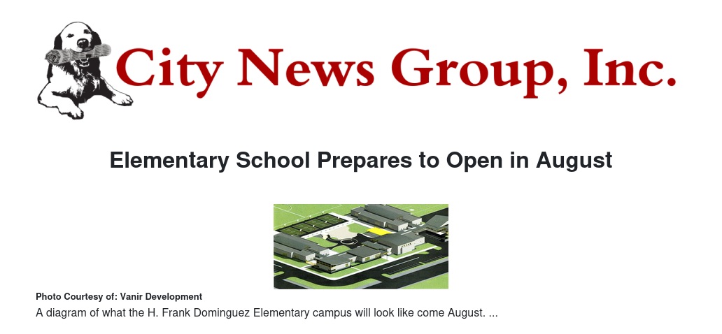 H. Frank Dominguez Elementary School opens its door in August. With over 10 acres of property, H. Frank Dominguez will hold 19 classrooms for grades K-6. The school is projected to enroll 600 students in the San Bernardino City Unified School District. The campus will integrate Apple software via iPads and mounted projectors will be available in all classrooms. Amenities will also include a lunch shelter, playground equipment, a computer lab, library and baseball fields.