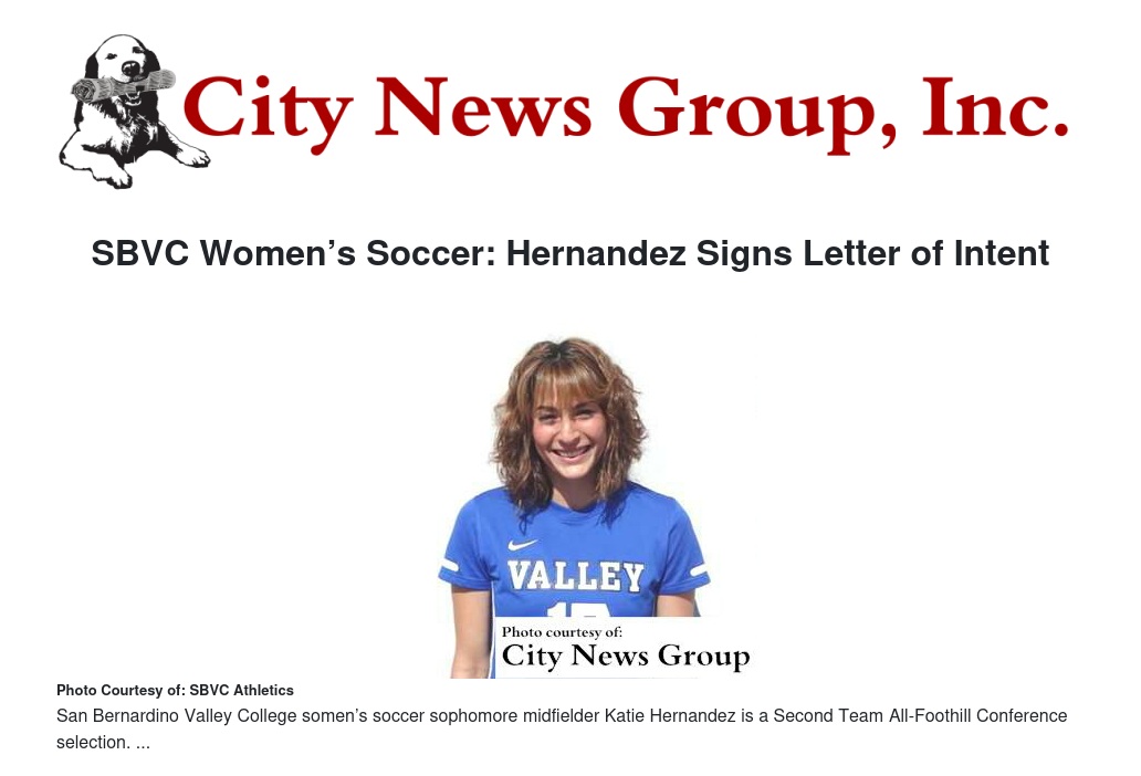 San Bernardino Valley College somen’s soccer sophomore midfielder Katie Hernandez (Beaumont High School) has signed a letter of intent with Kansas Wesleyan University.
