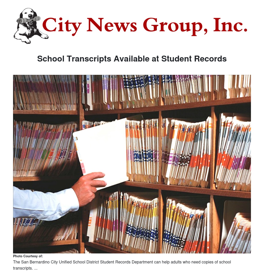 Adults who previously attended District schools and need copies of their school transcripts for college admissions, job applications, or any other reason are encouraged to visit www.sbcusd.com/studentrecords or call the Student Records Department at 909-880-6615 before visiting the office.