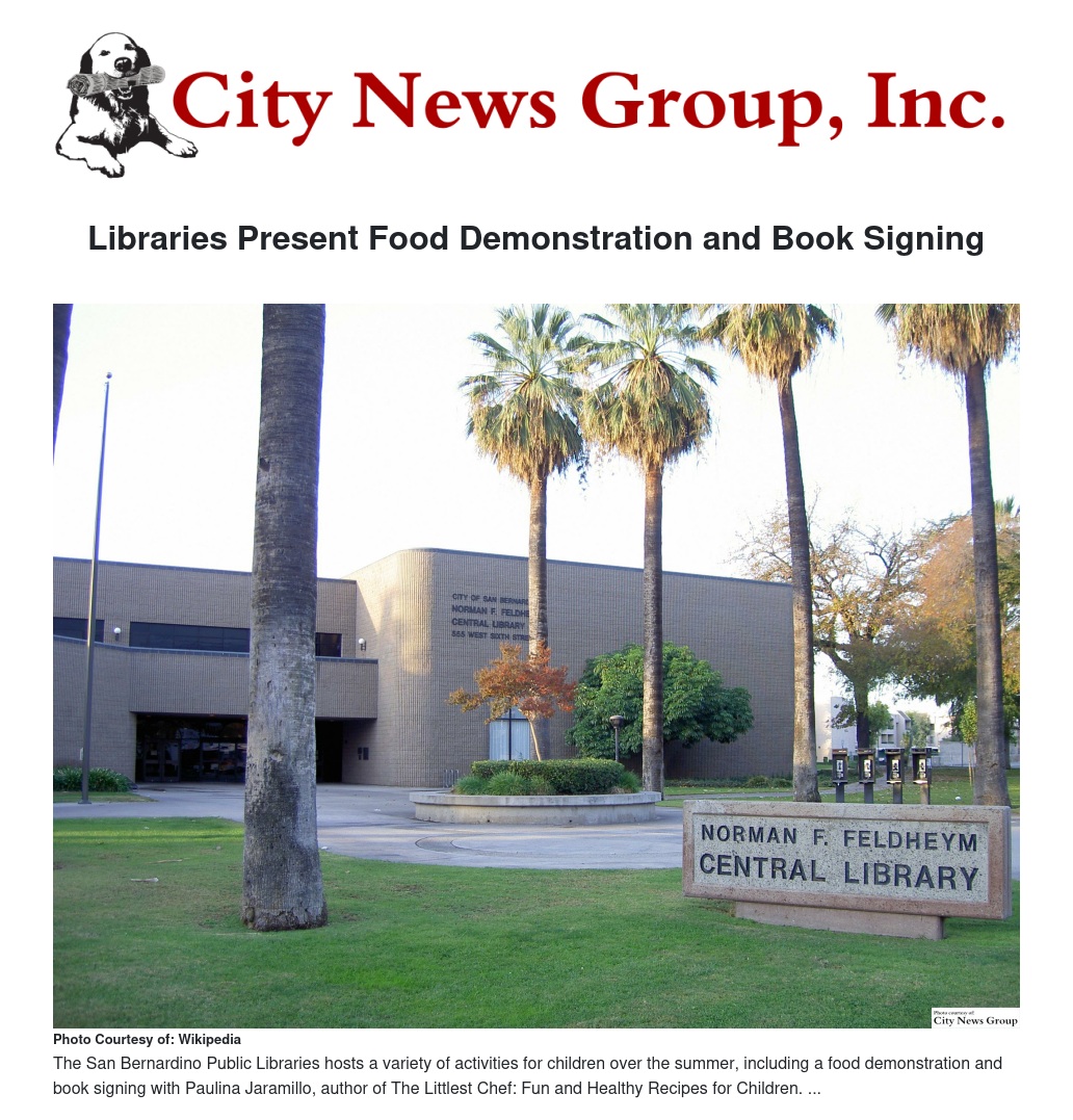 SAN BERNARDINO >> As part of library summer activities, three of the San Bernardino Public Libraries will be hosting food demonstrations and book signings by Paulina Jaramillo, author of The Littlest Chef: Fun and Healthy Recipes for Children.