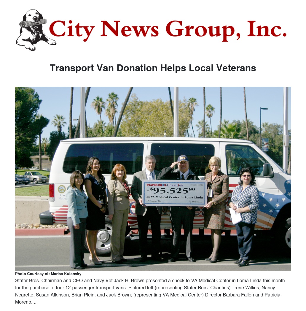 Stater Bros. Charities recently provided over $100,000 in funding for the purchase of four 12-passenger transport vans for the VA Medical Center in Loma Linda.
