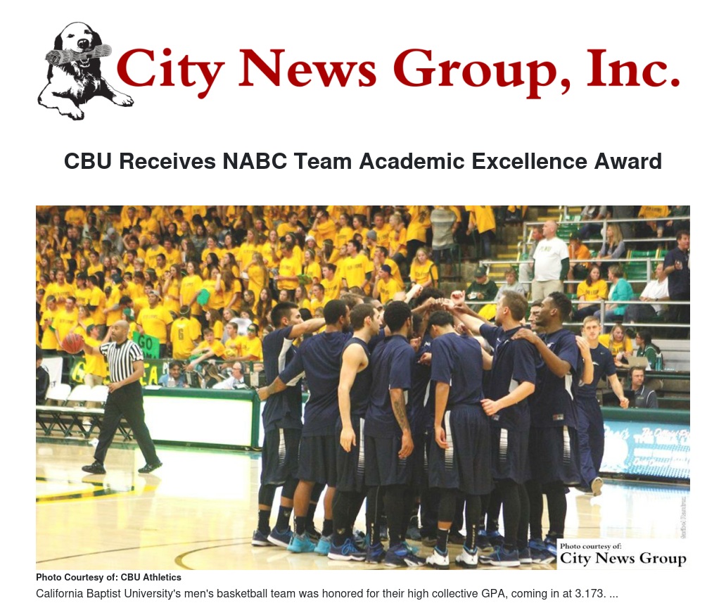 With a team GPA of 3.173, California Baptist University's men's basketball team received a 2014-15 National Association of Basketball Coaches (NABC) Team Academic Excellence Award, created by the NABC Committee on Academics, as announced Tuesday.