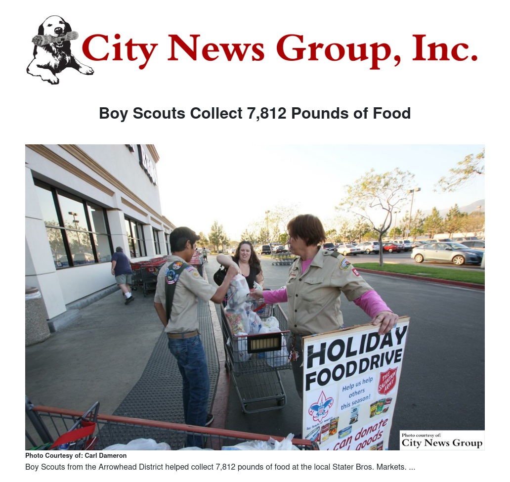 SAN BERNARDINO>> Boy Scouts from the Arrowhead District collected 7,812 pounds of food at local Stater Bros. Markets, and the almost four tons were donated to The Salvation Army’s San Bernardino Citadel Corps for the holiday season food drive.