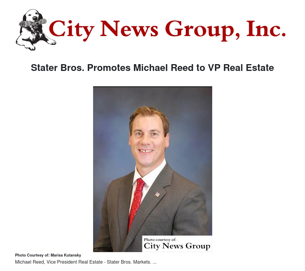Jack H. Brown, Executive Chairman of Stater Bros. Markets, is proud to announce the promotion of Michael Reed to the position of Vice President Real Estate for Stater Bros. Markets. Reed joined Stater Bros. in 2014 as Senior Director of Real Estate, a position he held until his recent promotion.