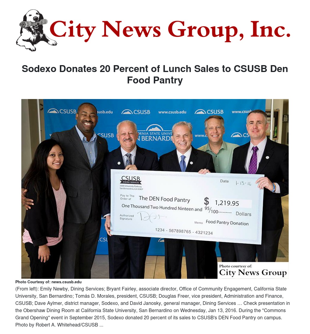 “Dave Janosky (CSUSB Dining Services general manager) and David Aylmer (Sodexo district manager) approached us looking for ways to help with the DEN’s mission,” said Bryant Fairley, associate director of the CSUSB Office of Community Engagement. “They recognized food insecurity among college students is a growing trend and wanted to see what they could do to help hungry CSUSB students.”