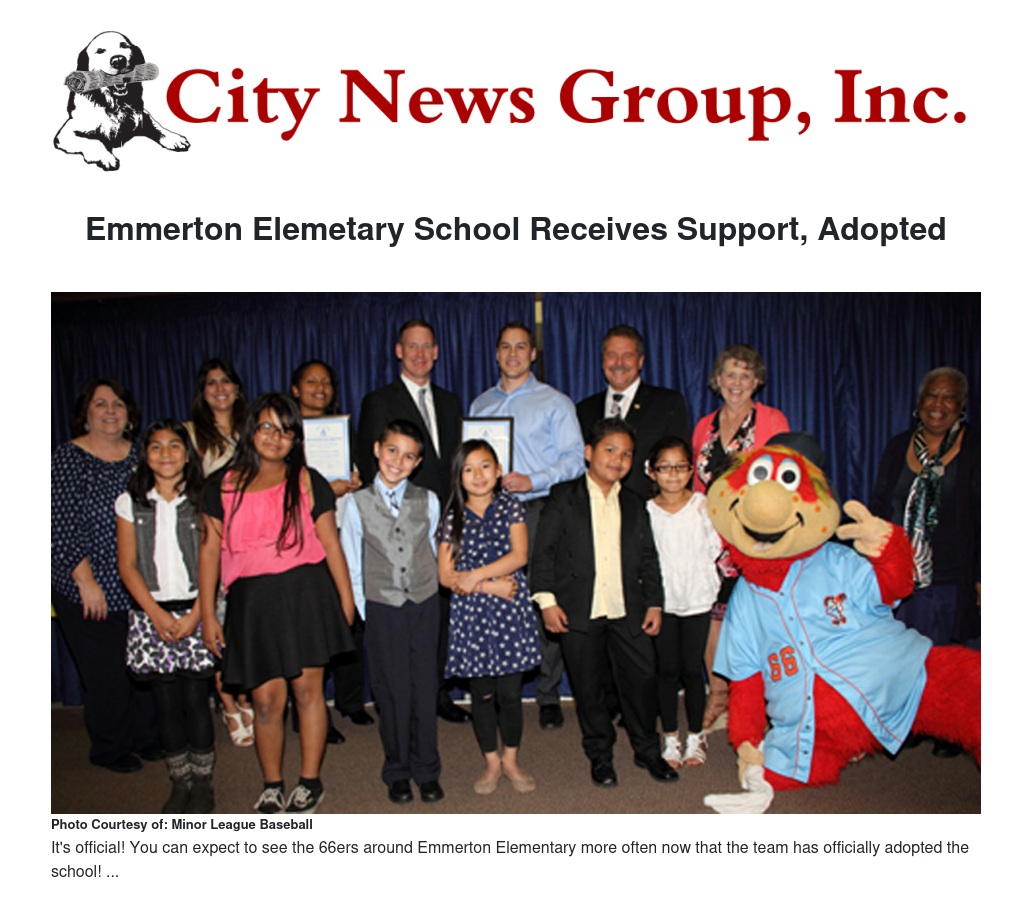 The 66ers already support Emmerton Elementary with their Hit the Books program, where their front office and the team’s mascot, Bernie, hold an assembly to teach the importance of reading. Students are rewarded for reading a set number of books or minutes with two free tickets to a baseball game. To strengthen their partnership, the 66ers have pledged to get more involved by attending the school carnival, family fun nights, and other family events.