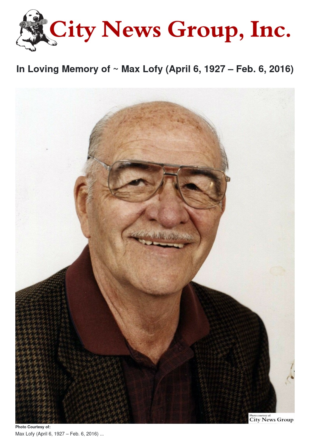 In Loving Memory of ~ Max Lofy (April 6, 1927 – Feb. 6, 2016)