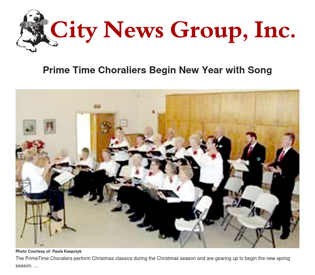 The Prime Time Choraliers are senior women and men age 55 and over who love to sing and share music. Many sing in church choirs, some are returning to singing after a life of raising families, and others simply love to sing. The group works toward the annual Spring Concert and other programs during the spring and Christmas season. This group performs at senior centers, civic and social clubs, at retirement facilities and hospitals, as well as churches of all denominations. The music covers patriotic, spiritual, popular, folk and songs from the 1940s, '50s and '60s.