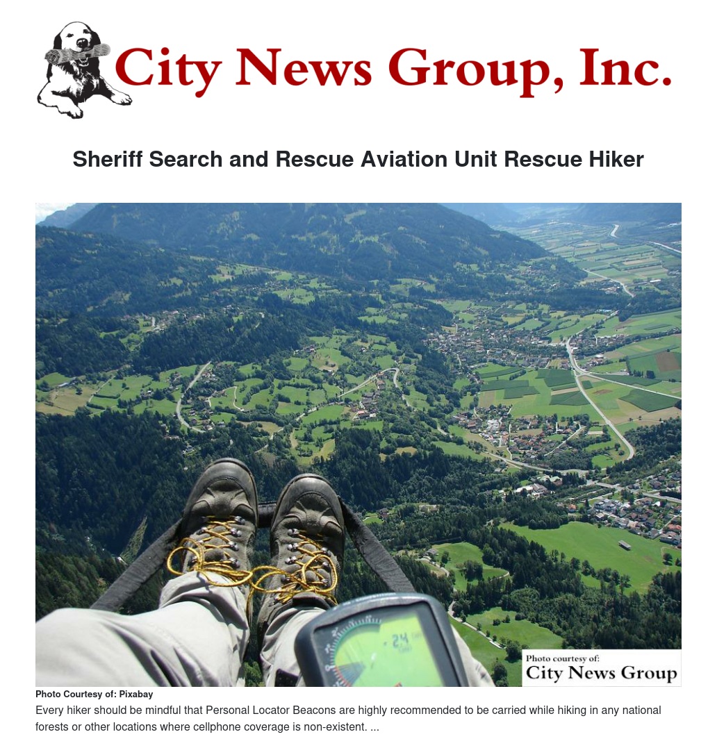 >>On May 31, 2017 at approximately 4:15 p.m., Sheriff's Volunteer Forces contacted the Aviation Unit regarding a hiker who activated a Personal Locater Beacon (PLB) on Pacific Crest Trail, near the North Fork area.