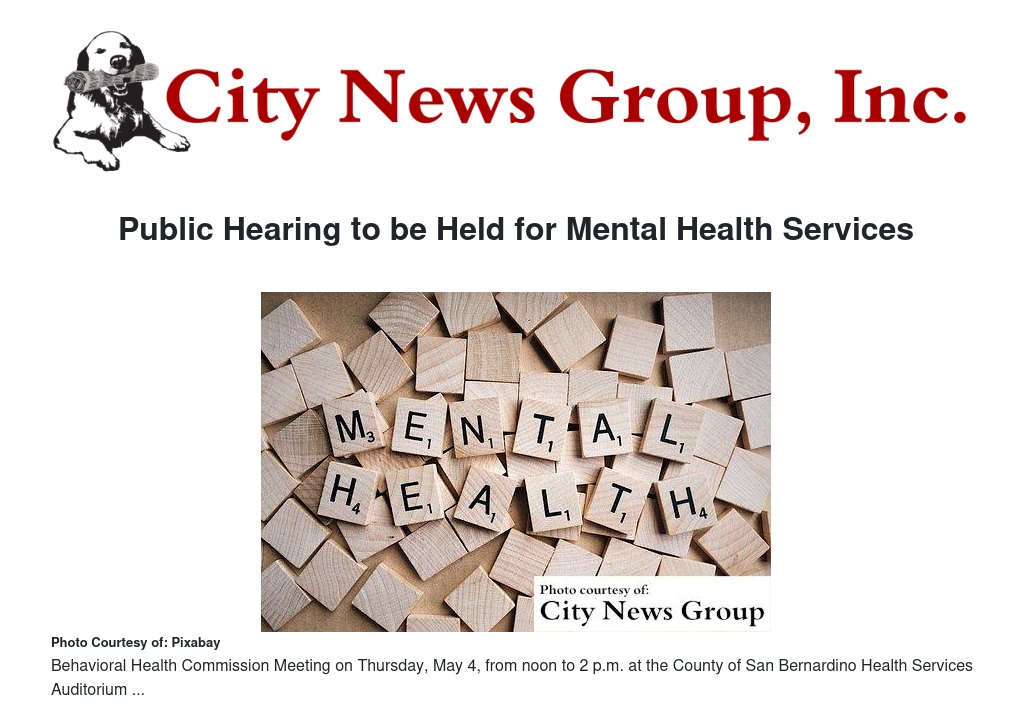 San Bernardino>> The San Bernardino County Department of Behavioral Health (DBH) invites members of the community to attend an upcoming public hearing regarding behavioral health services, program goals, related outcomes and the Community Program Planning process, as explained in the draft Mental Health Services Act (MHSA).