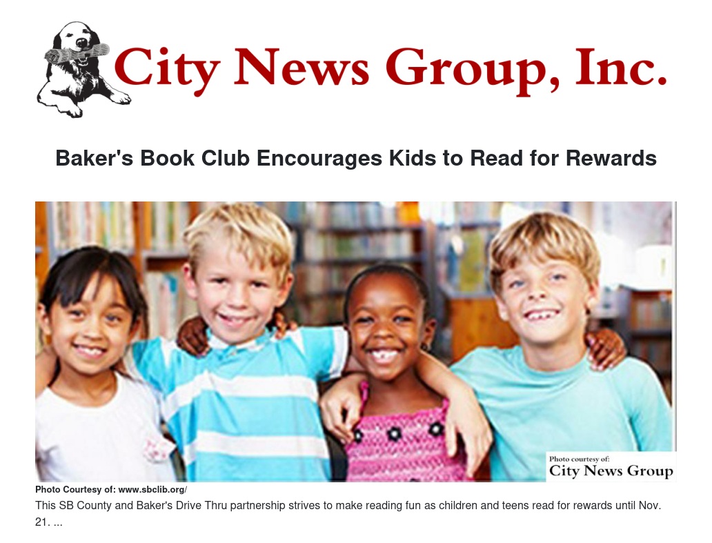The San Bernardino County Library is pleased to announce continued partnership with Baker’s Drive Thru to help promote reading during the Baker’s Book Club reading for rewards program.