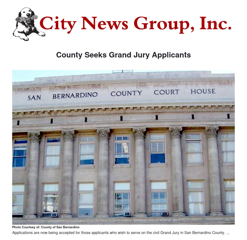 Volunteers for the 2015-2016 San Bernardino County Civil Grand Jury are now being requested, announced Marsha G. Slough, presiding judge of the Superior Court. The recruiting period is open for those citizens interested in serving. Successful applicants will serve as civil Grand Jurors for the period beginning July 1, 2015 and ending June 30, 2016.